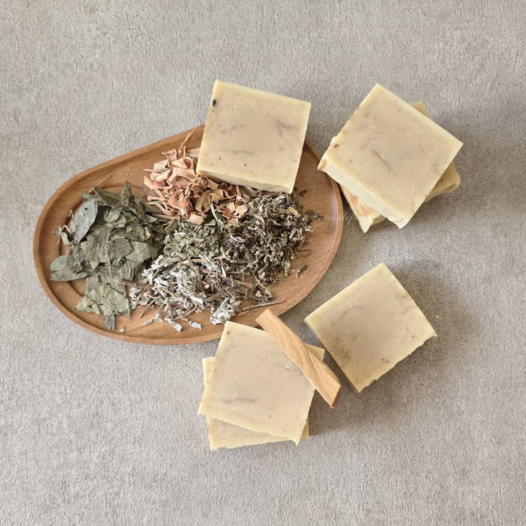 成分:椰子油、棕櫚油、杏仁油、橄欖油、甜杏仁、酪梨油、氫氧化鈉、午時水、艾草、抹草、芙蓉、香茅、薄荷、杜松漿果、祕魯聖木、岩蘭草、佛手柑、薰衣草、皂用粉..等